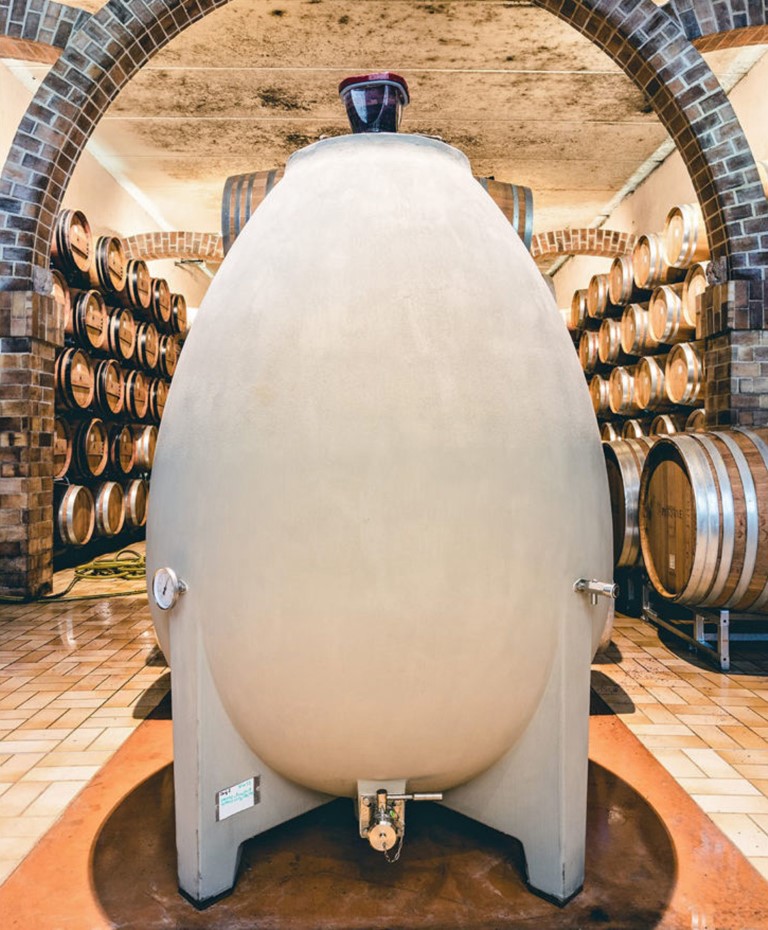 Οι τελευταίες εξελίξεις κάνουν αναφορά για οινοποίηση και παλαίωση σε δεξαμενές από σκυρόδεμα σε σχήμα αυγού. Οι ωοειδής αυτές δεξαμενές, εκτός των άλλων, επιτρέπουν τη δημιουργία φυσικής δίνης που ευνοεί τη συνεχή κυκλοφορία των συστατικών του κρασιού.Γαλλικά «αυγά» λοιπόν!!! Αυτή είναι η επικρατούσα ονομασία των ωοειδών τσιμεντένιων δεξαμενών. ( Ενδεικτικά www.berlinpackaging.gr και www.wine-egg.com ) ΕΠΙΣΤΡΟΦΗ